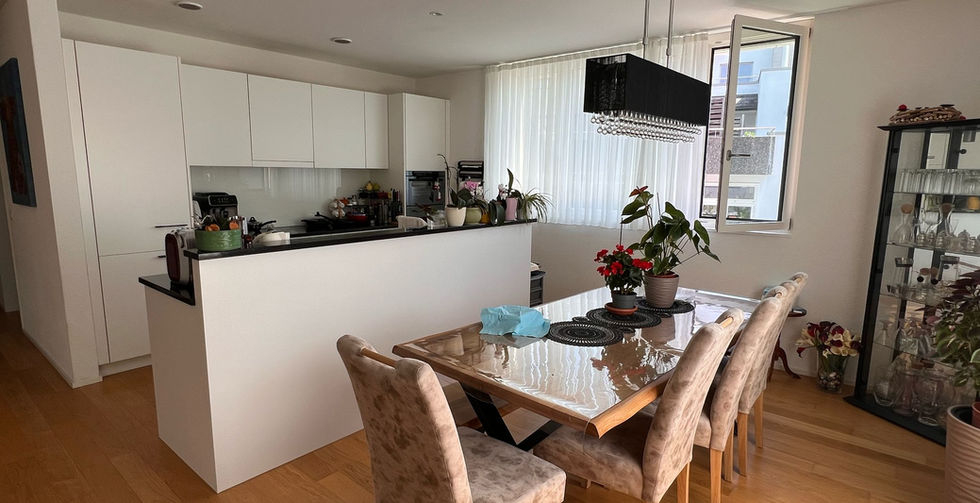 Der einladende Eingangsbereich mit integrierter Garderobe bietet viel Platz. Der offene Wohn-, Ess- und Küchenbereich mit hellem Eichenparkett und grosszügiger Fensterfront schafft ein lichtdurchflutetes und angenehmes Wohnklima. Die moderne, zweizeilige Küche ist mit hochwertigen V-Zug-Geräten ausgestattet, die Arbeitsflächen bestehen aus edlem Naturstein.